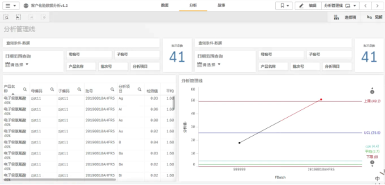 客戶化驗數(shù)據(jù)單的結果,通過BI的方式展現(xiàn)。數(shù)據(jù)的維度是批號,度量是化驗項目的檢驗值。查詢條件分成兩塊:一是根據(jù)日期范圍、母編號、子編號、產(chǎn)品名稱、批次號、分析項目來檢索數(shù)據(jù);二是根據(jù)日期范圍、母編號、子編號、產(chǎn)品名稱、批次號、分析項目來計算基準值(比如UCL、LCL、CL+2σ、CL-2σ等)。整體數(shù)據(jù)展示,增加顯示滿足篩選條件統(tǒng)計的批次總數(shù);圖表數(shù)據(jù)表格展示(左側表格);通過UCL、LCL、上限、下限、CL+2σ、CL-2σ、平均、cp、cpk這些基準值指標來分析檢測值展示檢驗結果的圖表(右側折線圖);增加分析項目檢測值單位顯示(折線圖左側)。